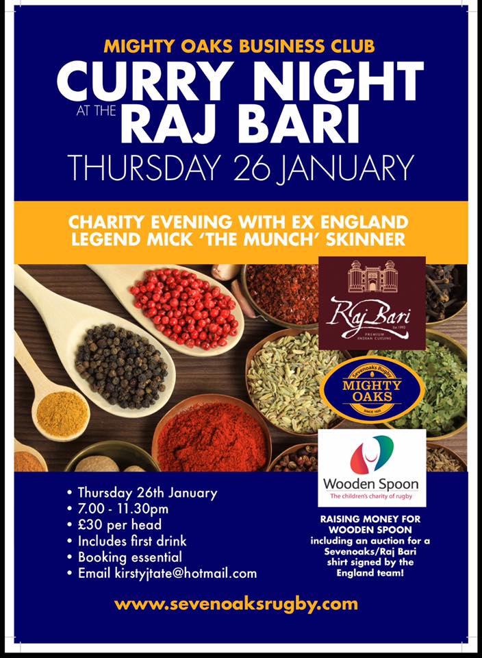 We’re kicking off 2017 with a curry night at the Raj Bari, a local club sponsor, on 26th January, our guest will be the ex-England rugby legend Mick Skinner. The Business Club takes pride in supporting their local sponsors and working together to continue to raise money for charity. If you would like to come along on 26th January there is a cost of £30 per head which includes a set menu and a free drink. The Raj Bari will also be making a donation to our chosen charity, The Wooden Spoon, from the proceeds of the night.